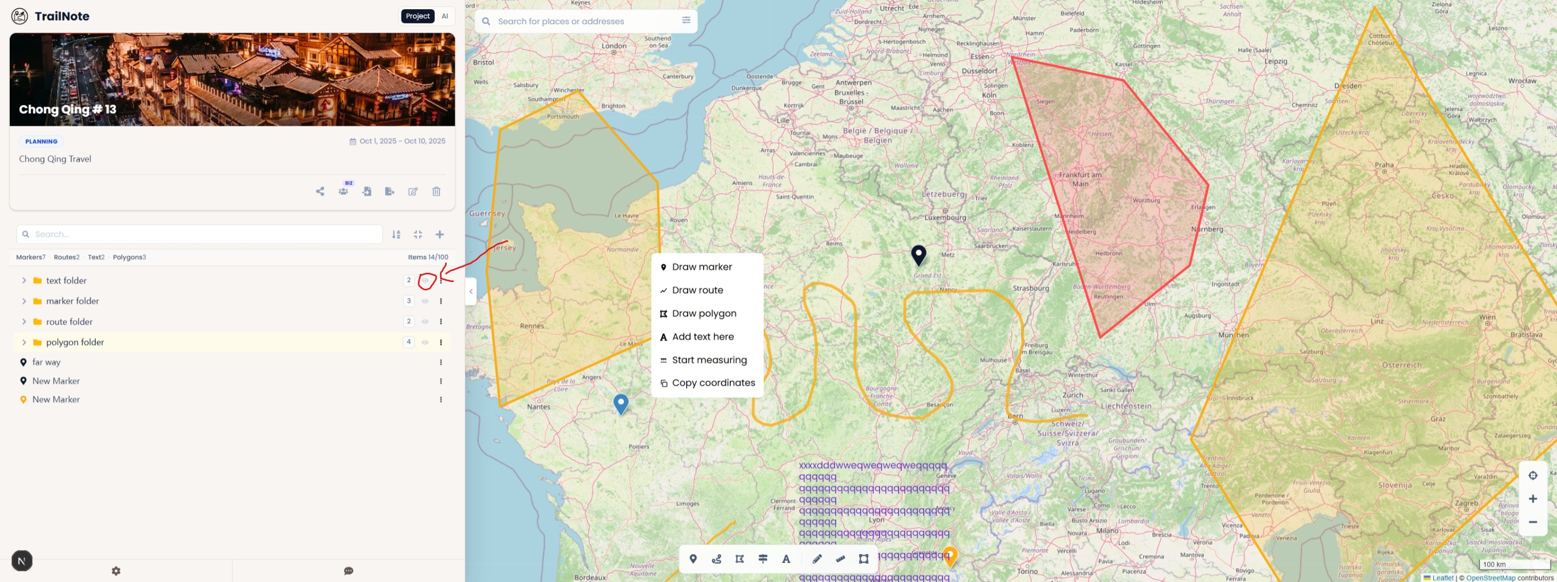 Use folder visibility when your project has enough items that the map is hard to read. It is especially helpful for multi-day trips, imported GPX collections, alternate routes, and projects with many labels or polygons.